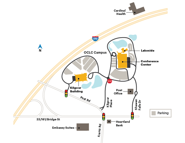 Bei der Annäherung an die Kreuzung der Route 161/33 / Frantz Road von der I-270 kommend in westlicher Richtung begegnen Sie irreführenden Straßenschildern. Um OCLC zu erreichen, biegen Sie nördlich (links) ab Richtung Post Road. Nehmen Sie bei der ersten Ampel die Ausfahrt zur I-270 und biegen Sie sofort rechts ab zum Kilgour Place.
