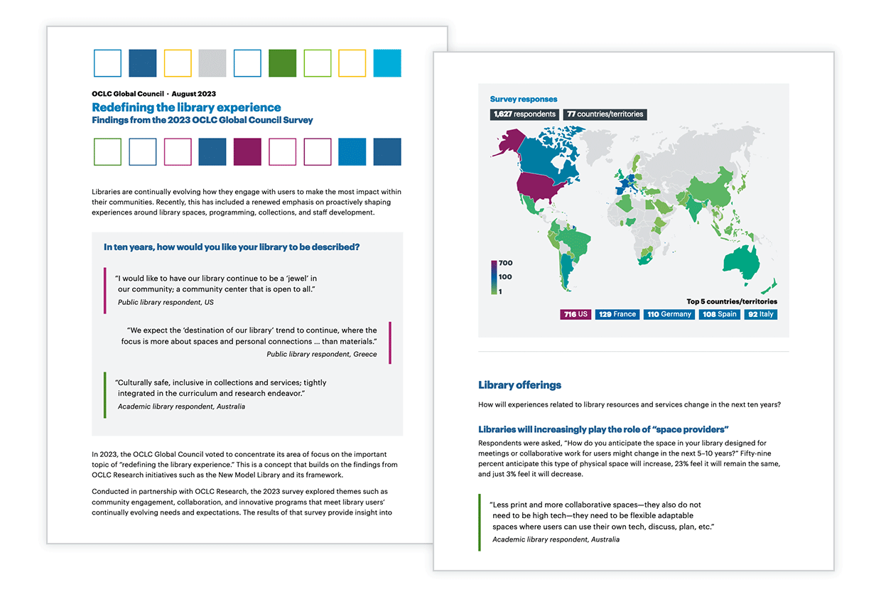 Redefining the library experience: Findings from the 2023 OCLC Global Council Survey, conducted jointly by OCLC Global Council, OCLC Research, and the OCLC Market Research team, explored themes such as community engagement, collaboration, and innovative programs that meet library users’ evolving needs and expectations. The results provide insight into ways that library leaders and workers expect changing library experiences to create more meaningful engagement and positive impacts.