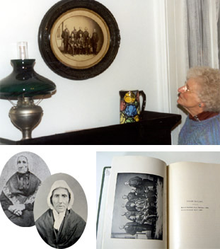 Clockwise from top: The photograph of the DeCamp brothers from the family home; the same picture as is appears in the family history found in Cincinnati; Phoebe Hedges Baker marsh, the researcher's great-great-great-grandmother, and her sister Mary Baker Decamp—theDeCamp family connection discovered in WorldCat.
