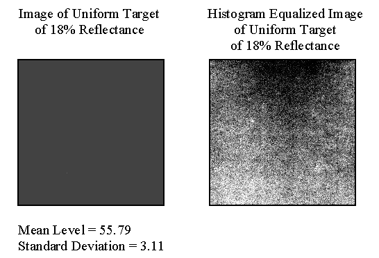 A useful technique to assess the response and illumination variability over the field of view is to acquire an image of a uniform target and to perform histogram equalization on the image. In histogram equalization, the original image's pixel levels are redistributed to achieve a uniform distribution in the output image. The histogram of an image is a graph of the frequency of occurrence of its pixel levels. Spatial variations that are not apparent in the original image often become apparent in the histogram-equalized image. This technique is illustrated in fig. 7. In this case, although the unequalized image appears uniform, unevenness in the illumination is quite apparent in the histogram-equalized image. The top is noticeably darker, there is evidence of smudges or fingerprints on the glass, and there may be a slight darkening of several columns of pixels (i.e., in the slow scan direction) on the right side.